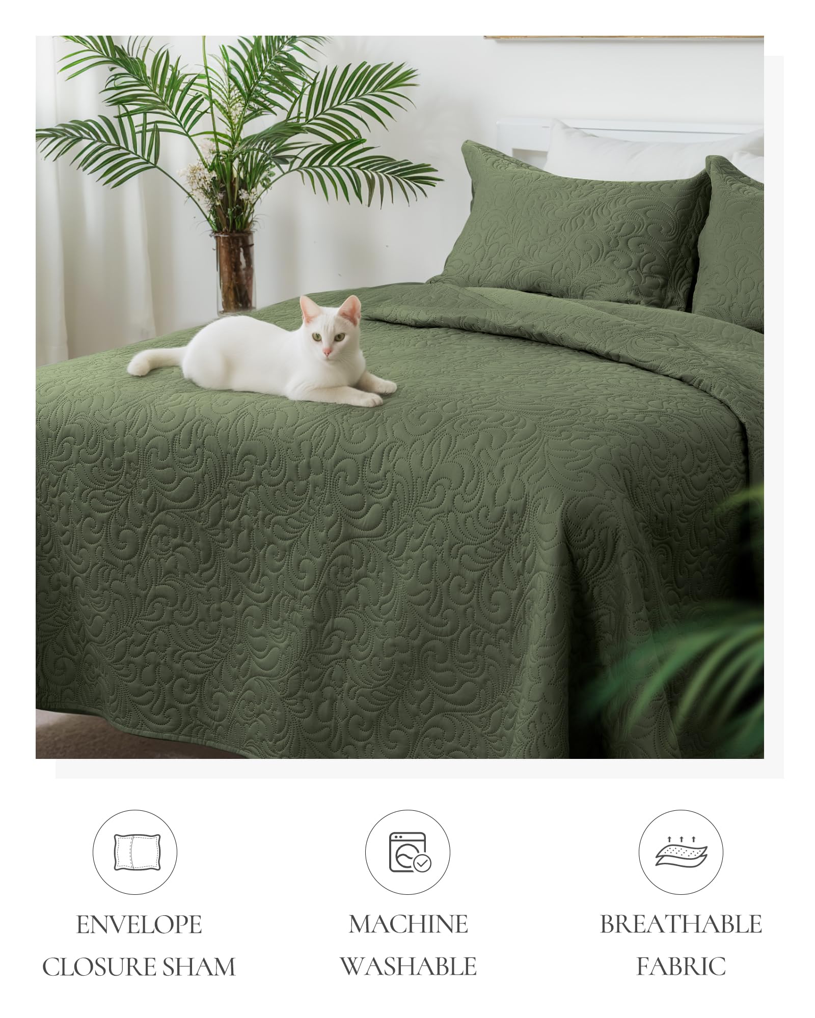 - 【EASY CARE】: Lightweight olive green quilts are easy to clean and will soften after washing. Machine wash in cold water and tumble dry under low temperature. Perfect way to dress up a bed affordably and comfortably.