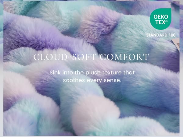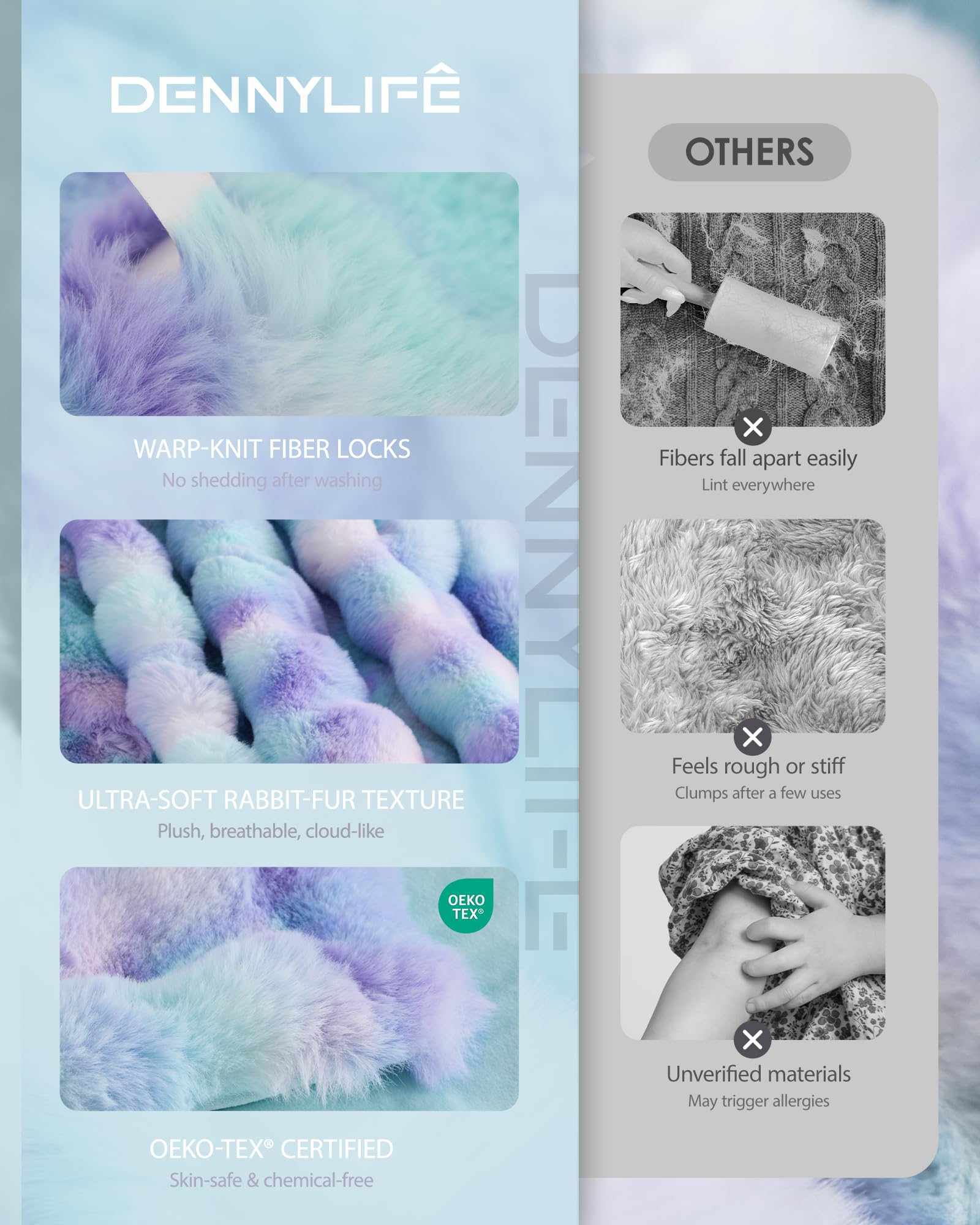- Inspired by the Northern Lights: This faux fur blanket blends soft lavender, aqua, and sky blue hues to mimic the glow of the aurora borealis. A whimsical plush blanket that adds dreamy color and calming energy to any space.